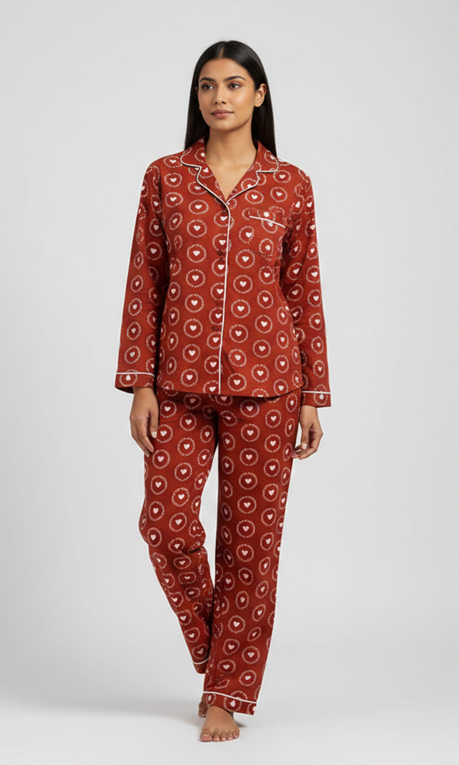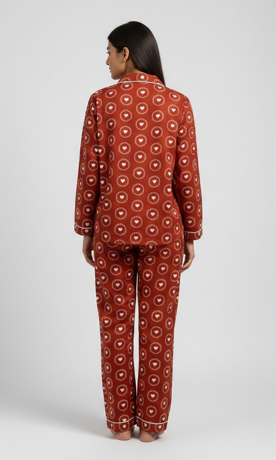 Contrast piping / white is used across our pajamas to highlight seams and give a refined finish.