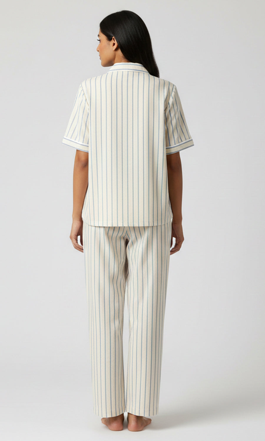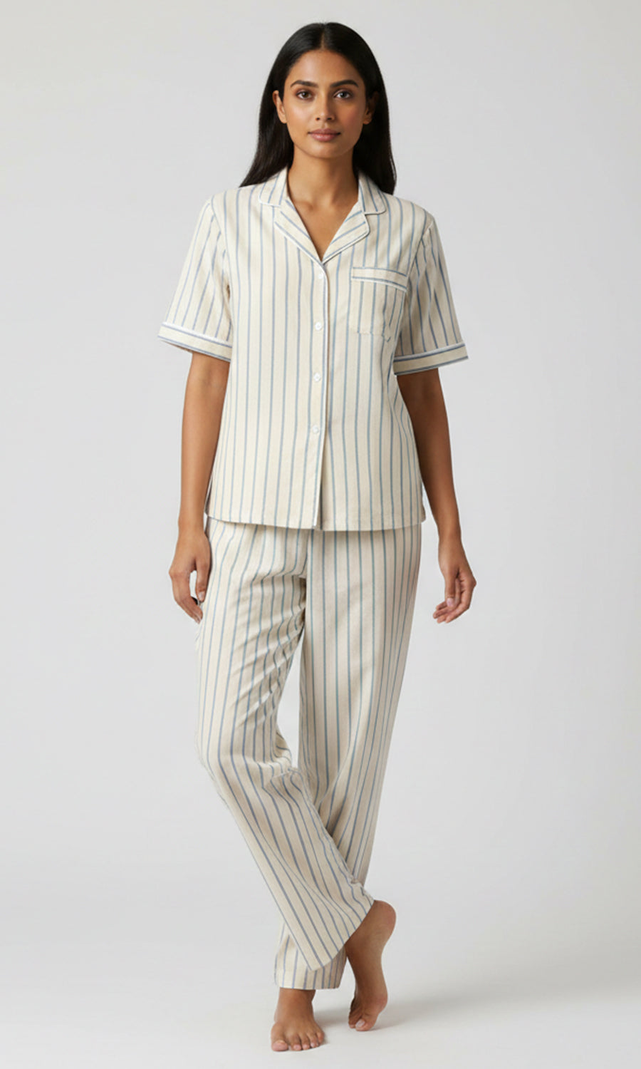 Contrast piping / white is used across our pajamas to highlight seams and give a refined finish.