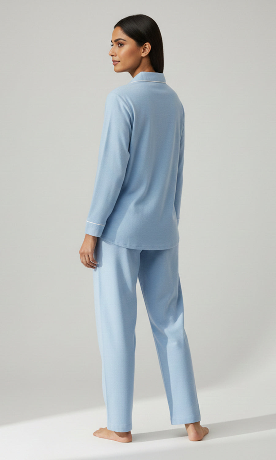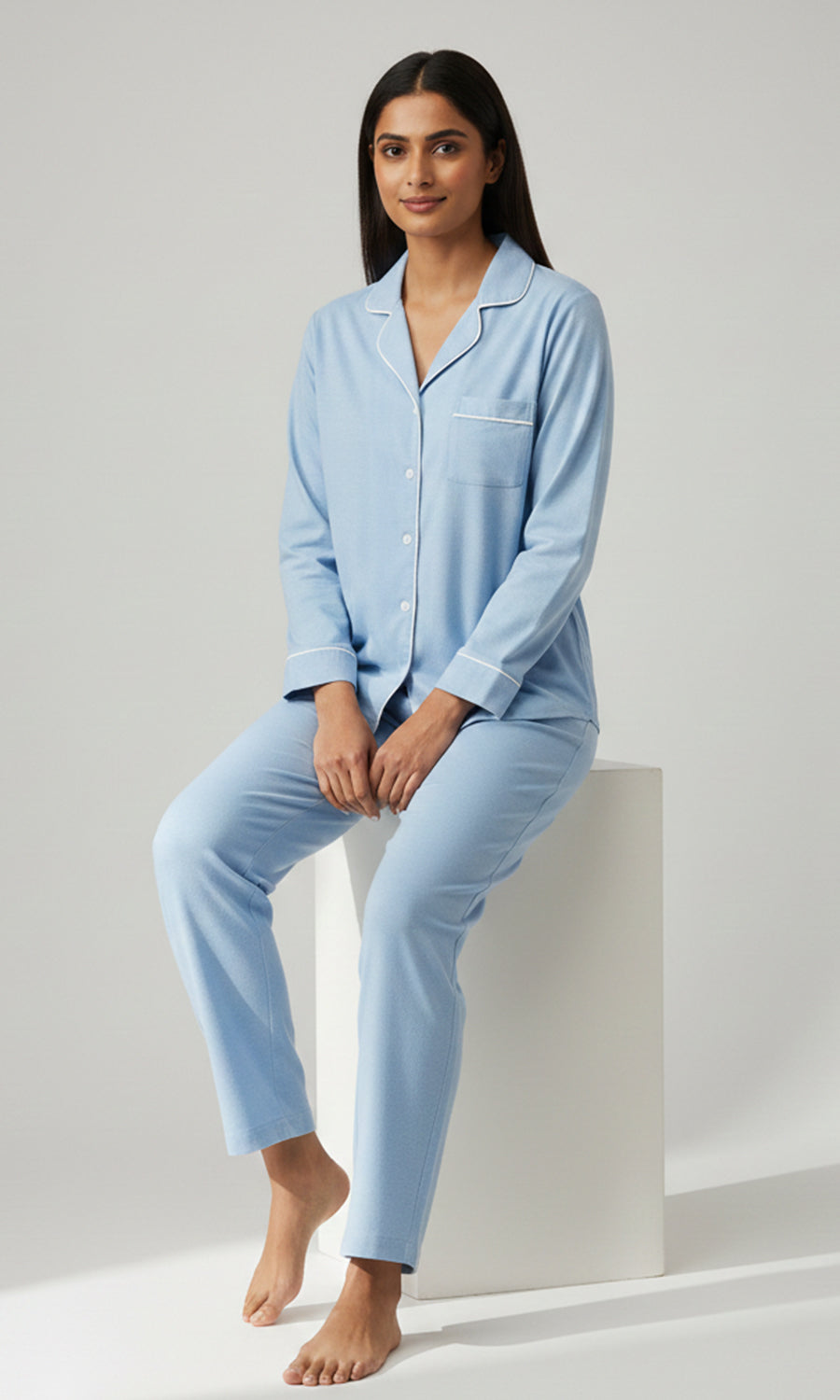 Contrast piping / white is used across our pajamas to highlight seams and give a refined finish.