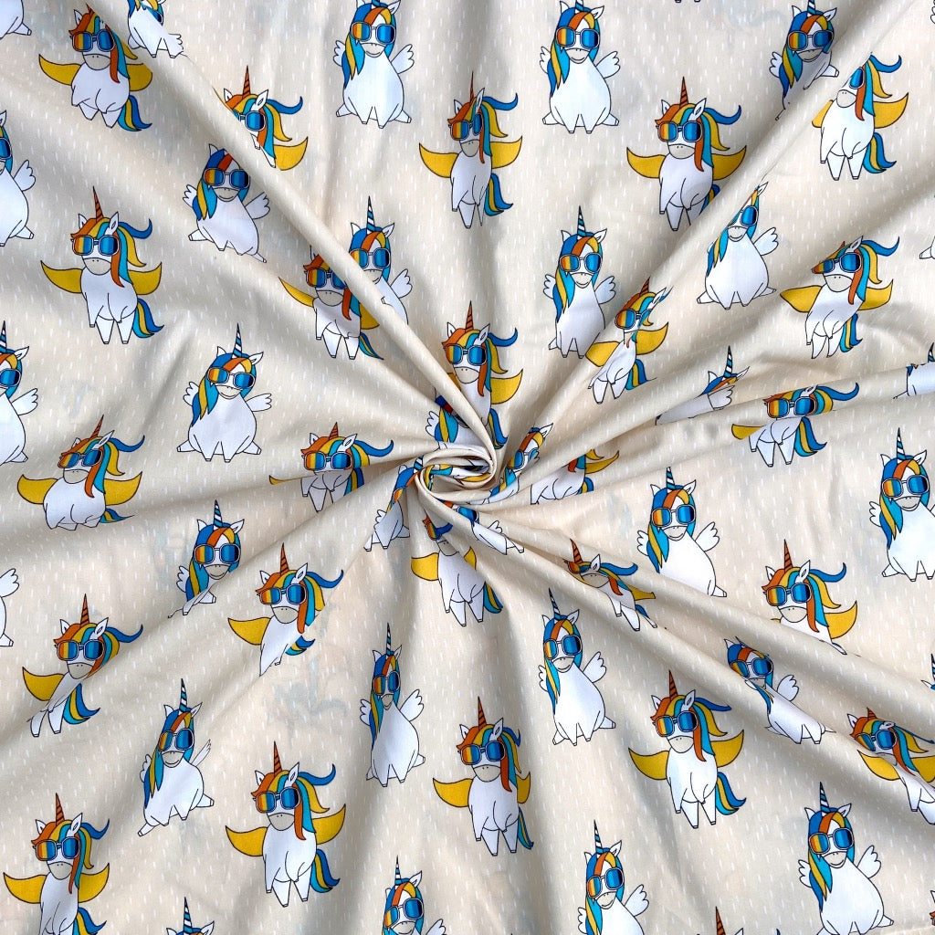 Colourful unicorns brighten cotton with magic and fun. Airy and light, it feels joyful and playful.