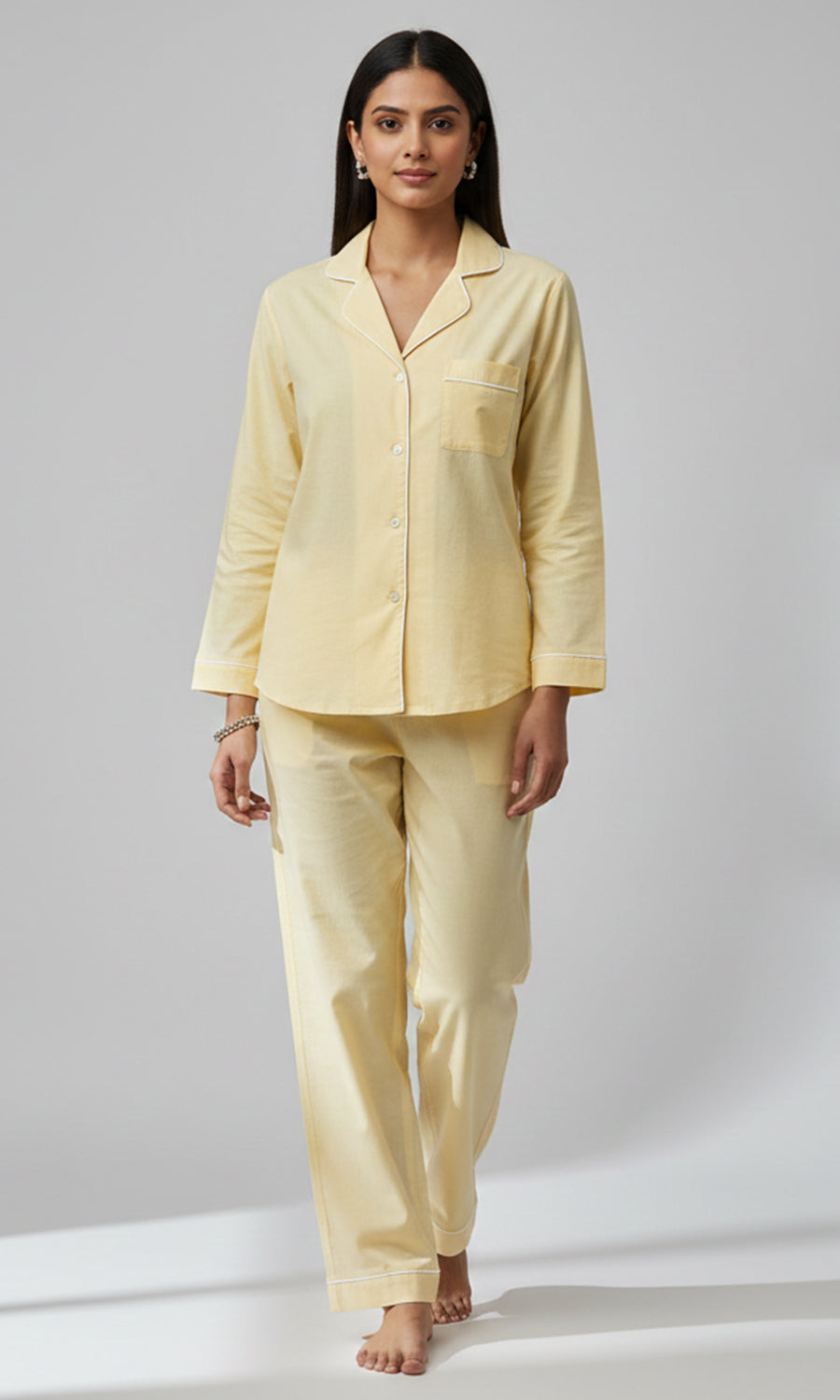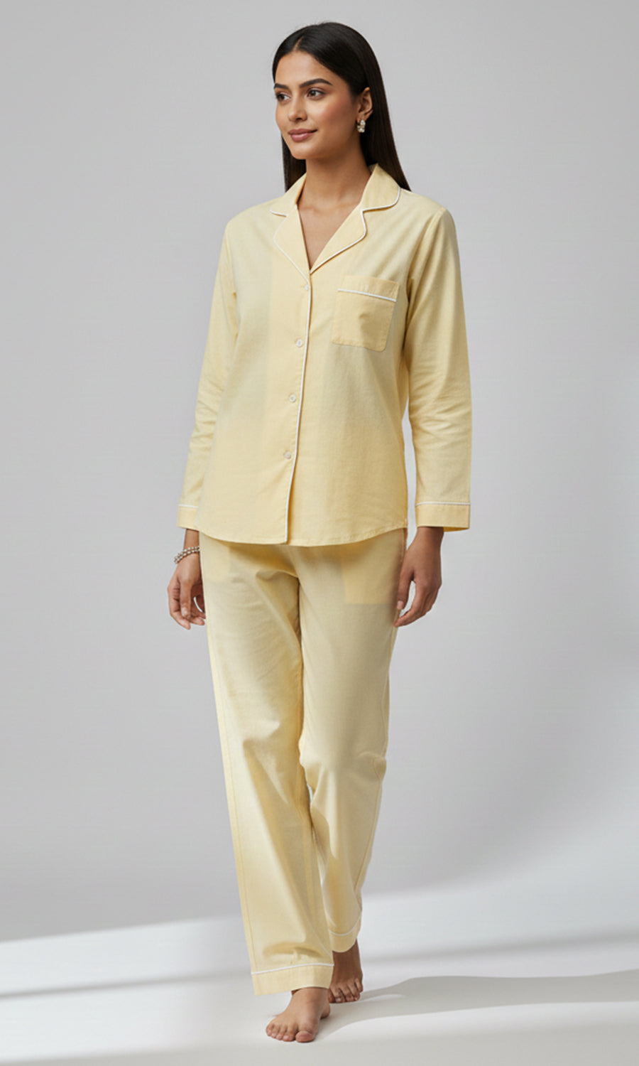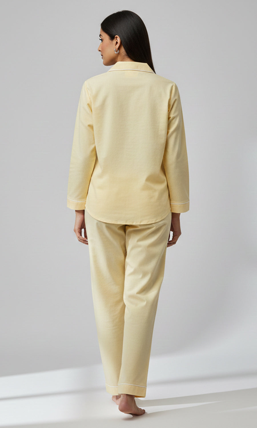 Contrast piping / white is used across our pajamas to highlight seams and give a refined finish.