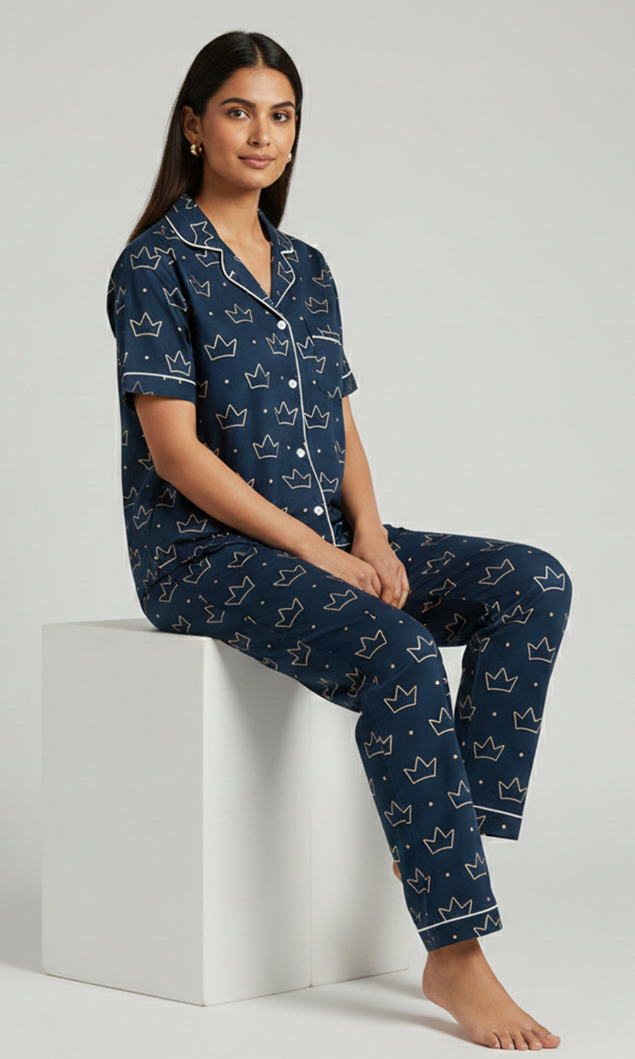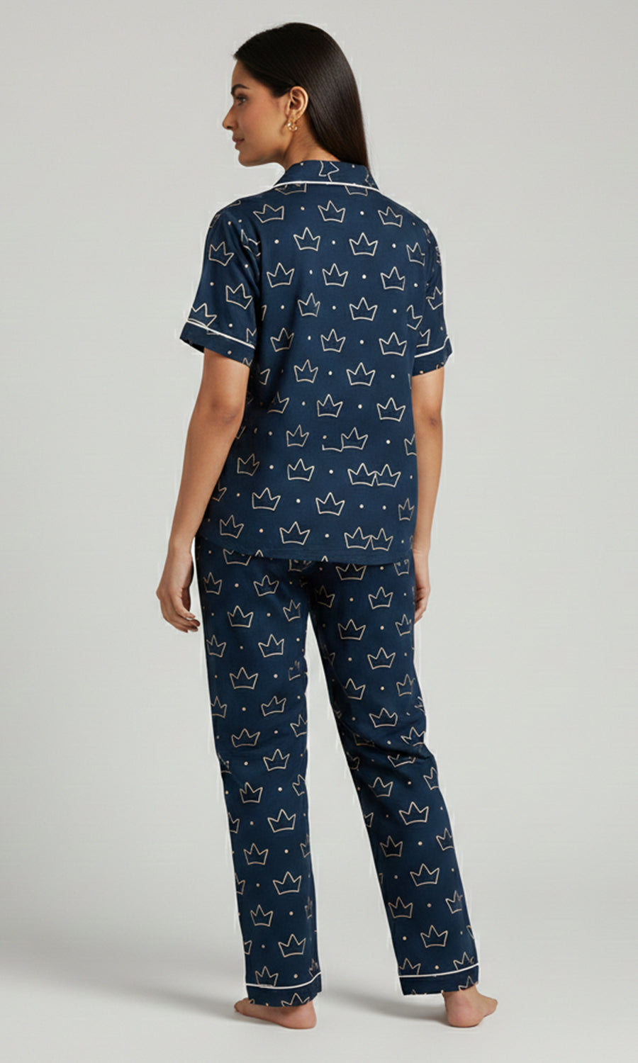 Contrast piping / white is used across our pajamas to highlight seams and give a refined finish.