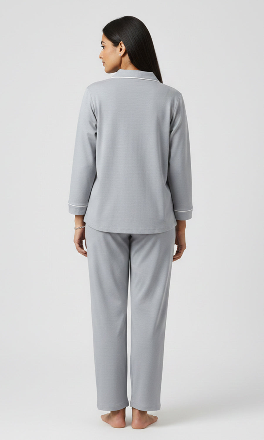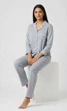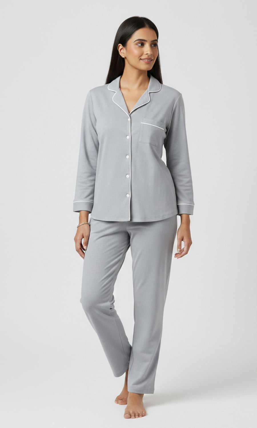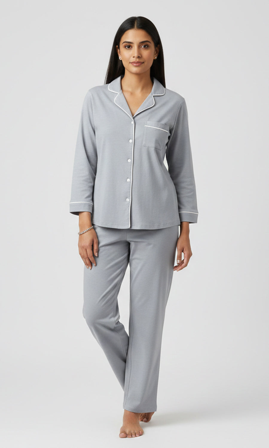 Contrast piping / white is used across our pajamas to highlight seams and give a refined finish.