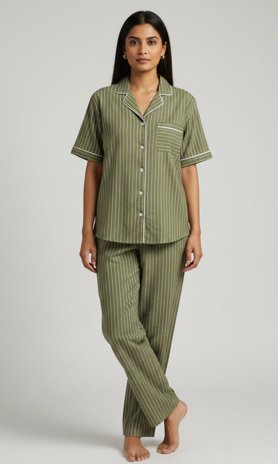 Olive Green Stripe Pajama Set for Women