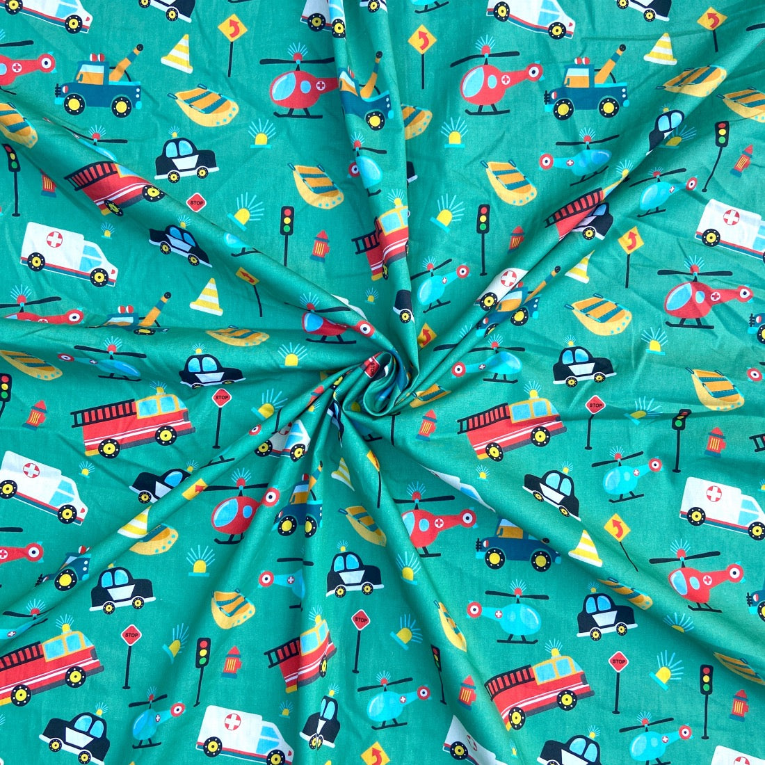 Colourful cars race across cotton poplin, playful and bold. Breathable, crisp, and comfortable for daily wear.