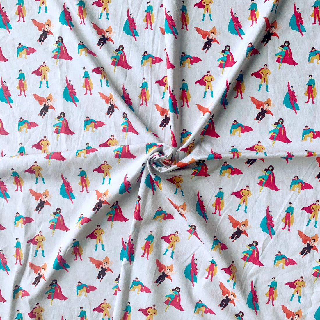 Superhero icons scatter across crisp cotton poplin, bold and fun. Soft, breathable, and perfect for kids who dream big.