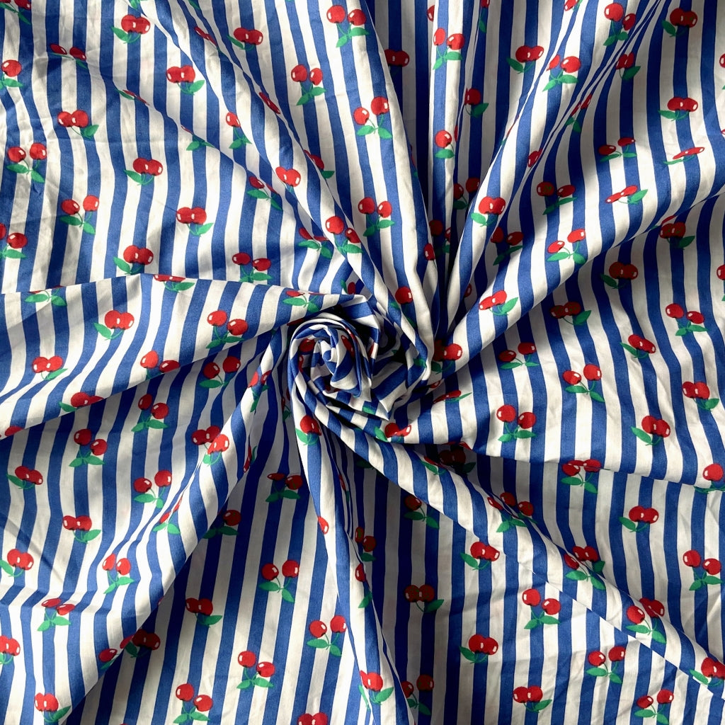 Bright cherries pop against airy cotton, bringing a fruity sweetness to the fabric. Crisp and soft, it feels fun and youthful.
