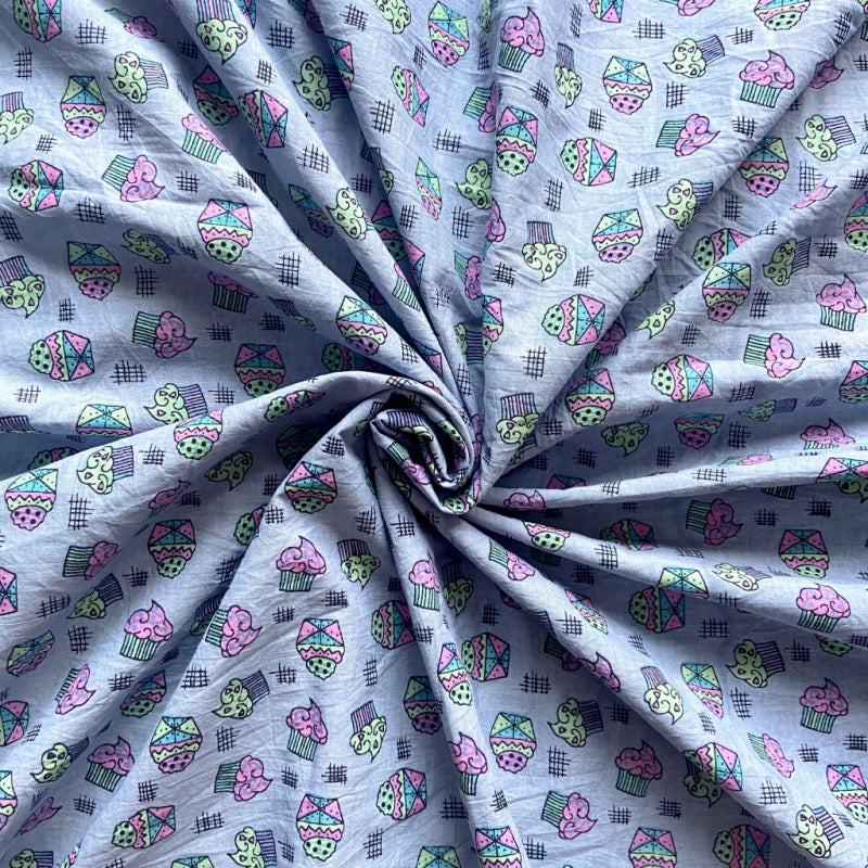 This Jaipuri cotton fabric is sprinkled with candy and sweet motifs in pastel tones, set against a cheerful blue base. Light, breathable, and skin-friendly, Jaipuri cotton makes playful prints like this comfortable for kids while still being durable for regular wear.