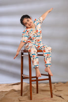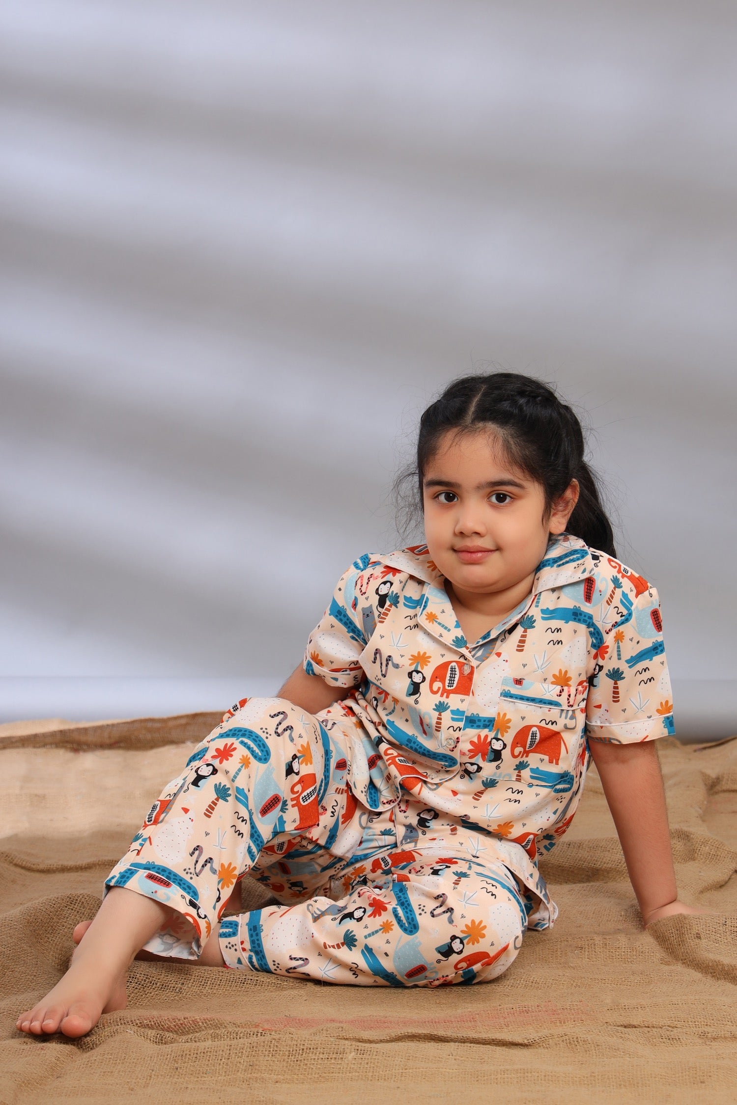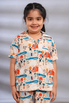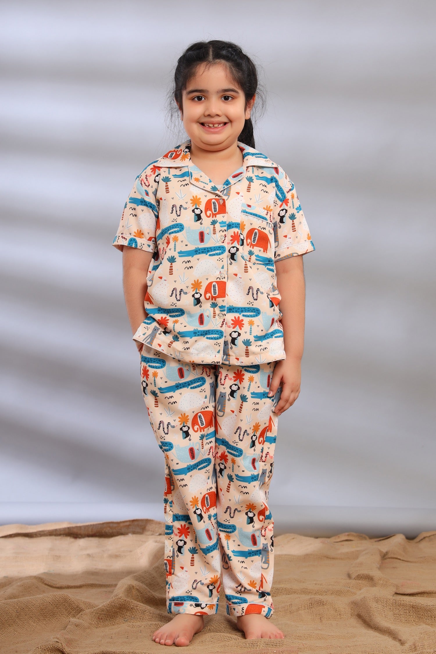 The half sleeved shirt & pajama set is perfect for your daughter or niece. The collared shirt has a pocket patch and the elasticated pajamas have side pockets too. This night suit has a playful style.