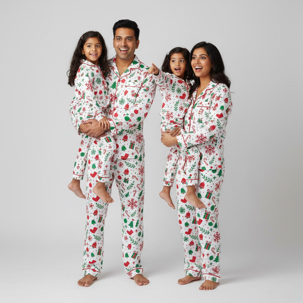 A festive blend of holiday motifs crafted for cozy family pajama sets and cheerful December lounging.