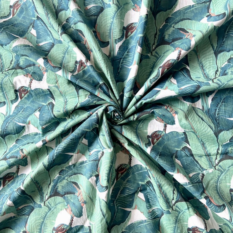 A vibrant Jaipuri cotton fabric featuring bold banana leaf motifs that capture tropical freshness. Known for its breathability and soft texture, Jaipuri cotton offers cool comfort and long-lasting wear, making it a great fit for relaxed leisurewear.