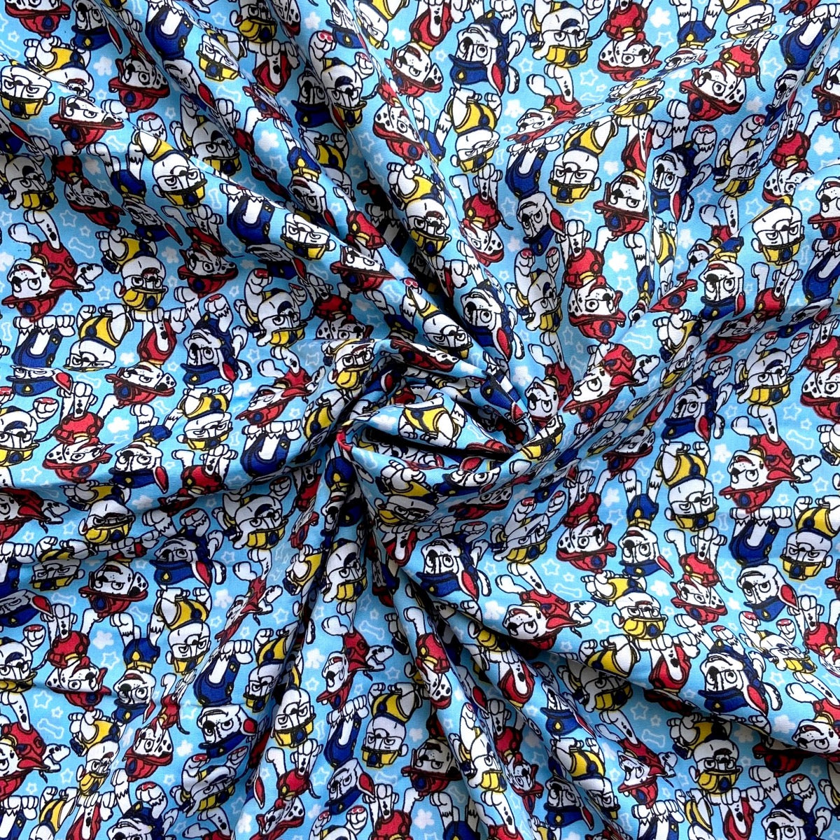 Packed with vibrant cartoon hero figures in red, blue, and yellow, this cotton fabric makes a bold and energetic statement. The weave keeps it breathable, durable, and easy to wear.