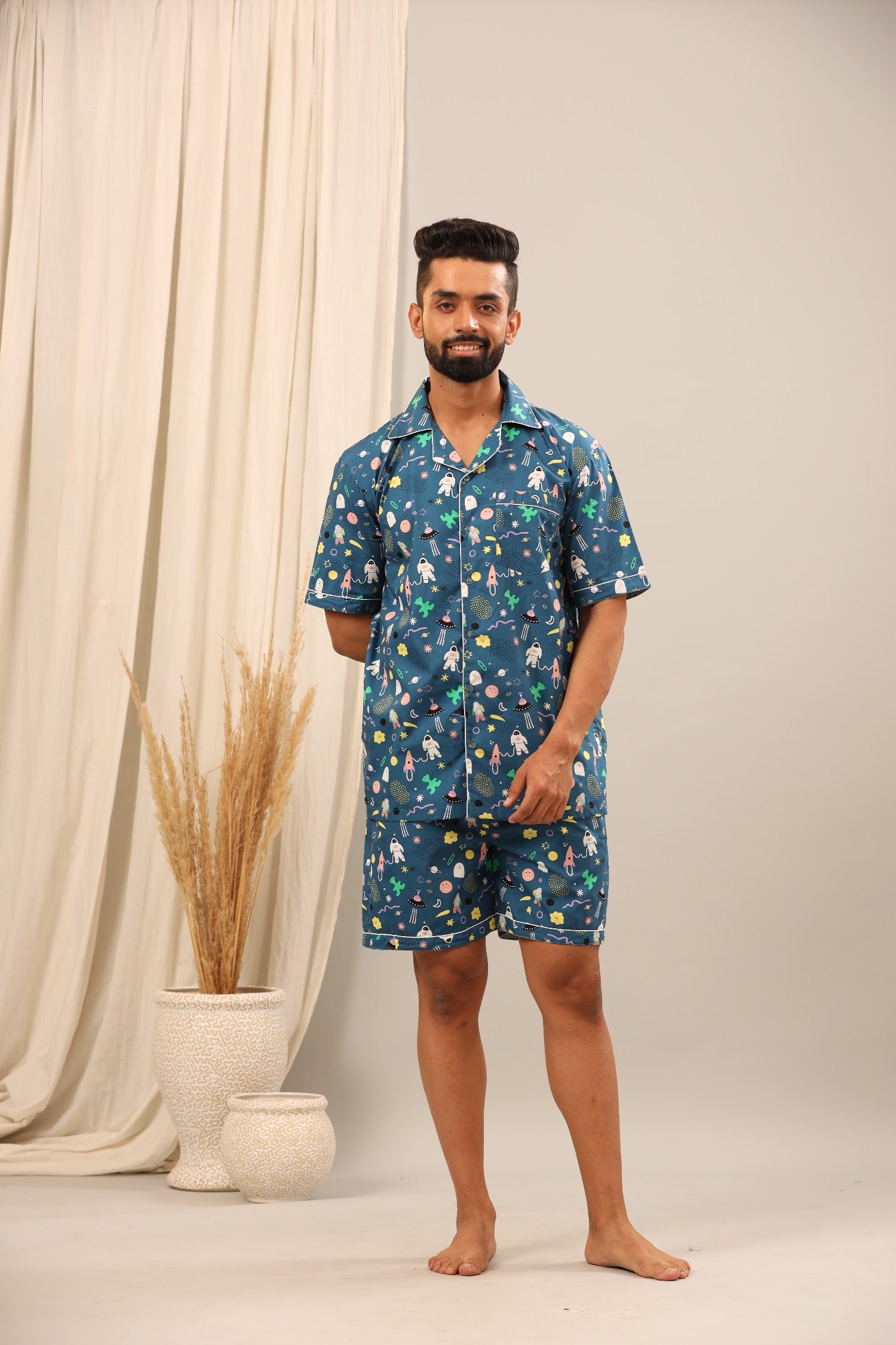Cool and relaxed, this men’s shorts set in Space Print cotton adds cosmic fun to everyday nightwear.