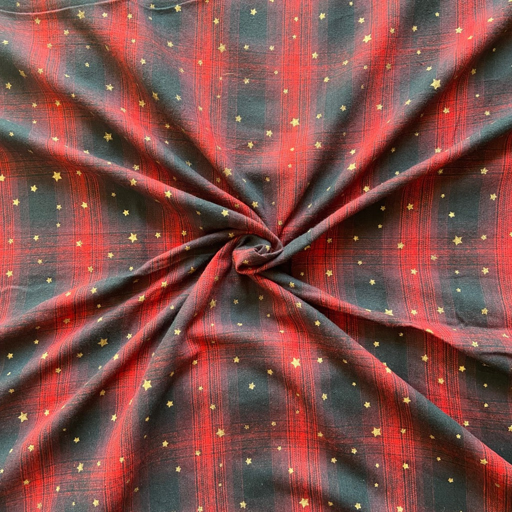 The Black and Red Starry Checks in Flannel combine classic checks with playful detail. Perfect for Christmas pajamas, winter lounging, or cousin pajama groups, this fabric balances warmth with personality.