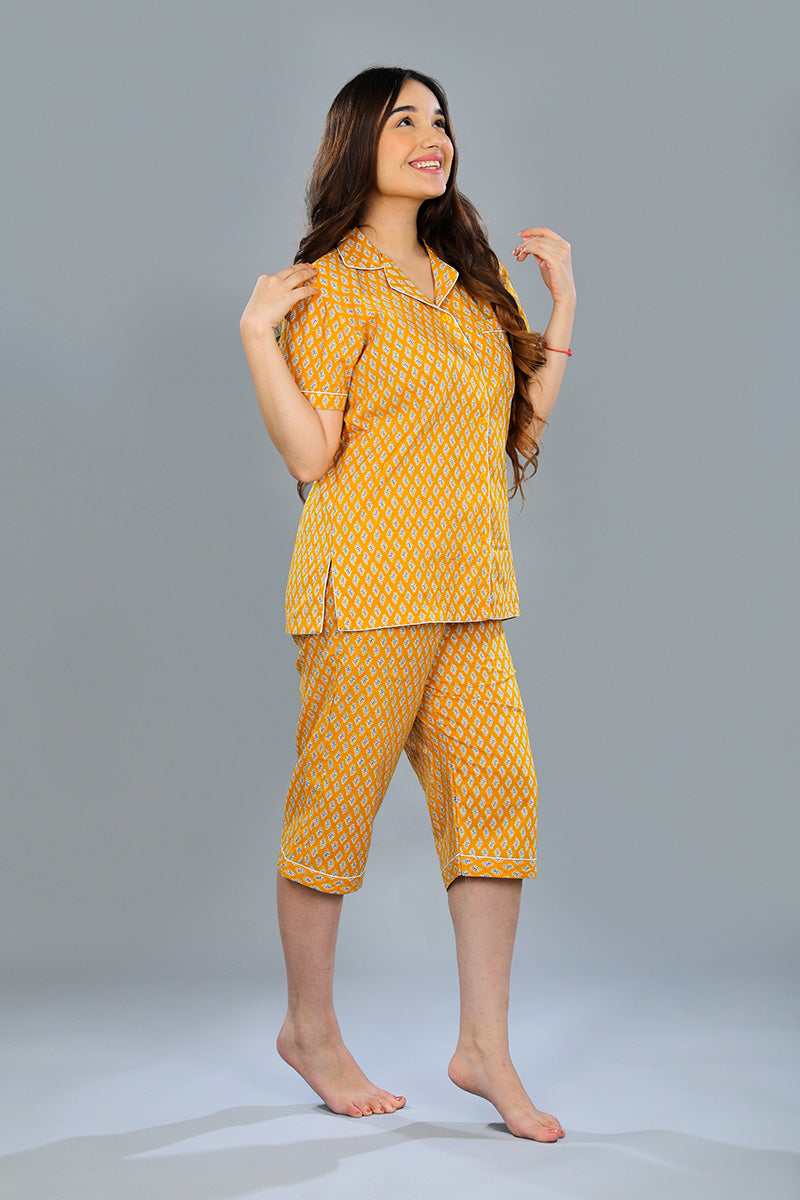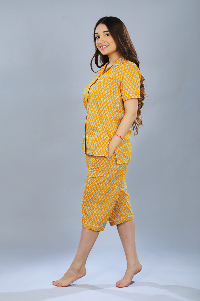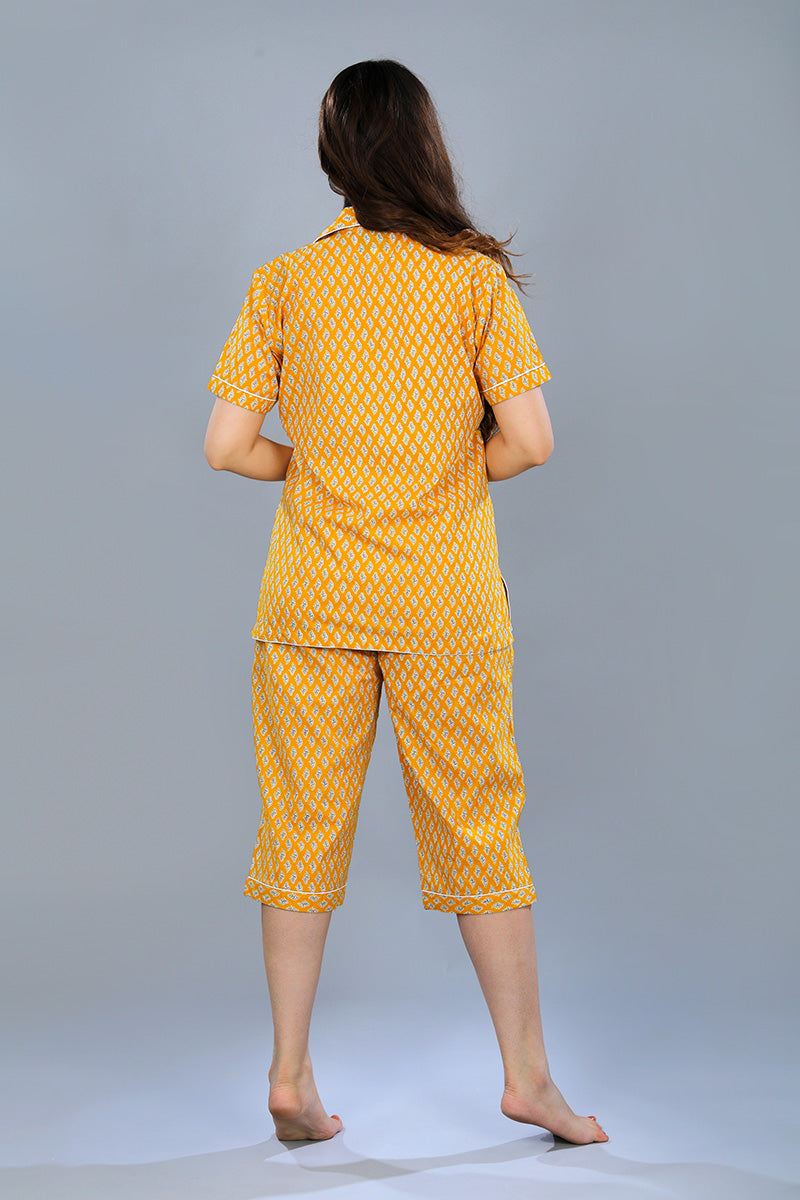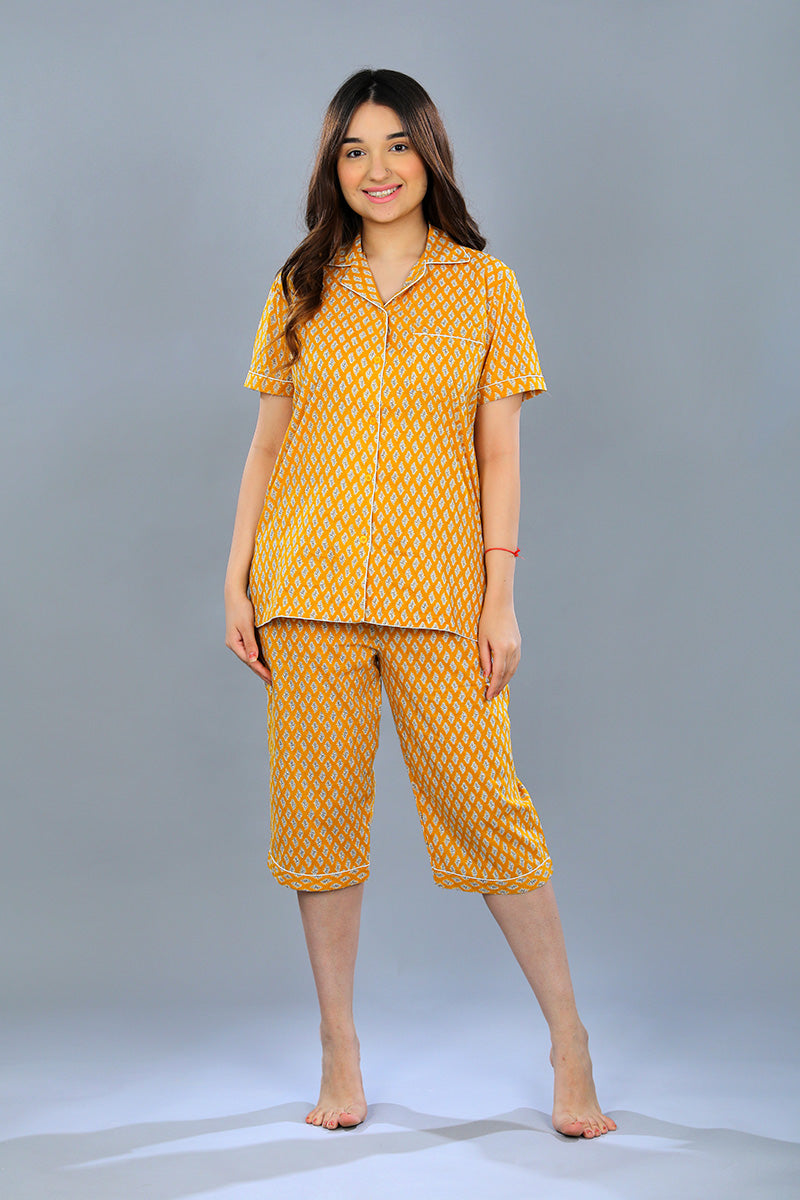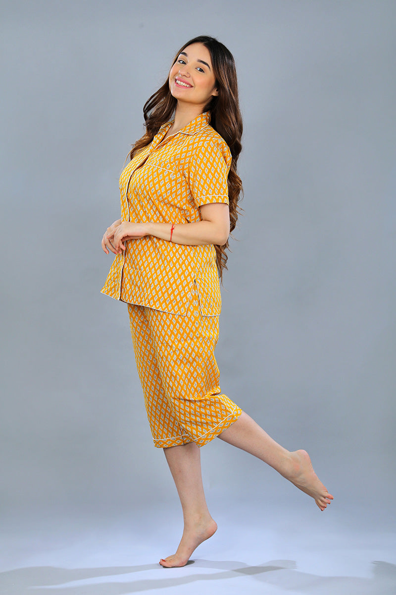A perfect mix of comfort and style, this capri pajama set is designed to keep you at ease through every season. The shirt features a classic notched collar with a front button opening, accentuated by matching piping for a polished finish. The capri-length bottoms come with an elasticated waistband and side seam pockets for effortless comfort.
