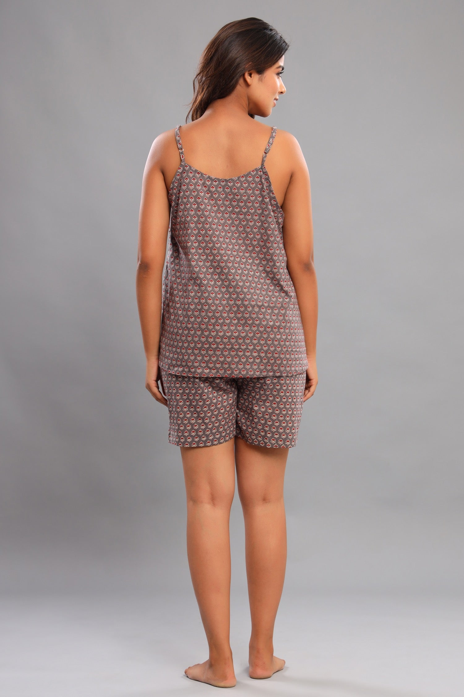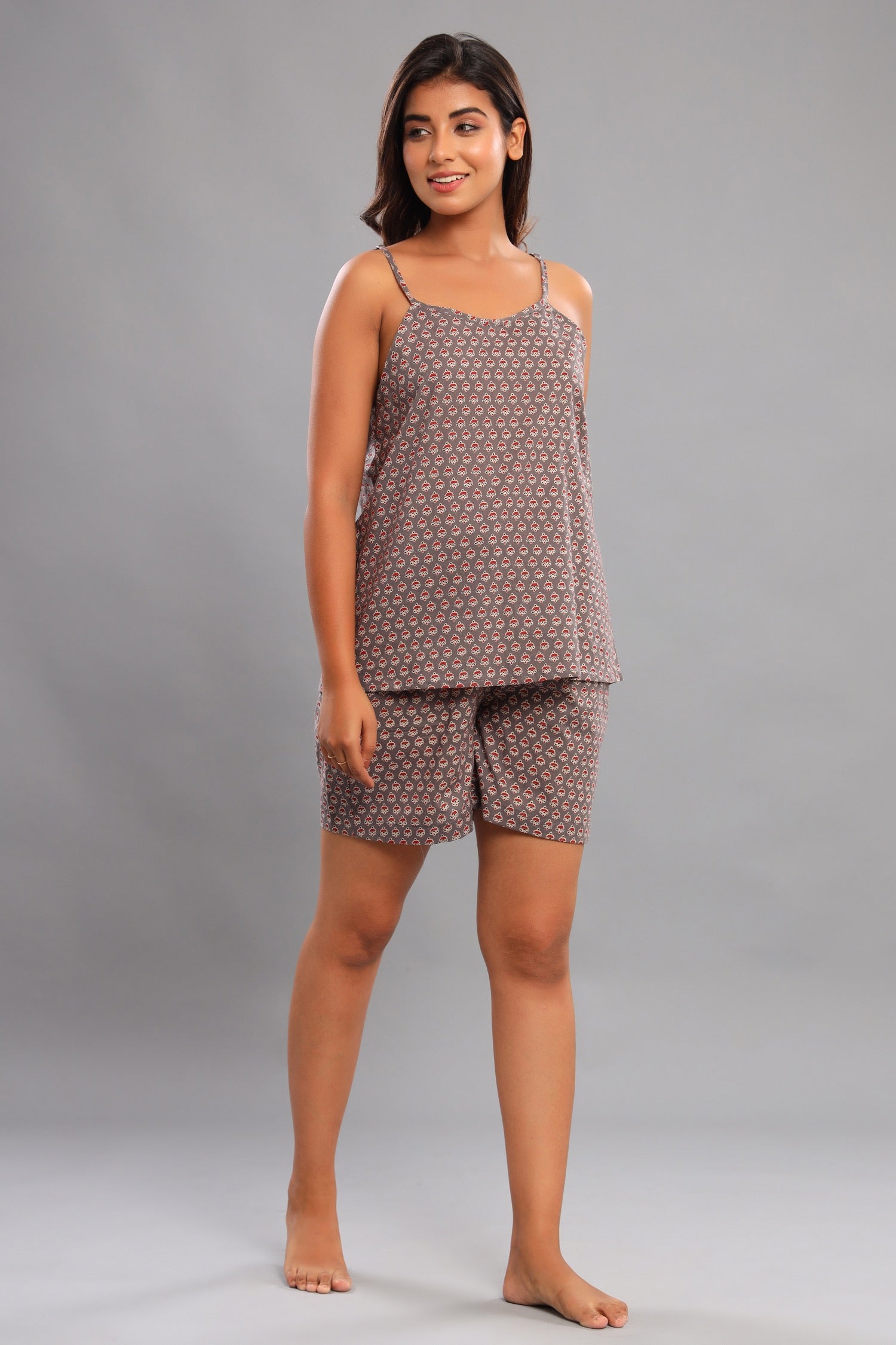 Lightweight and playful, this spaghetti top with shorts set is designed for easy comfort and chic lounging. The spaghetti top features delicate straps and a relaxed fit, while the elasticated shorts come with side seam pockets for added convenience. Finished with neat piping, the set offers a breezy silhouette that feels perfect for warm nights or casual lounging.