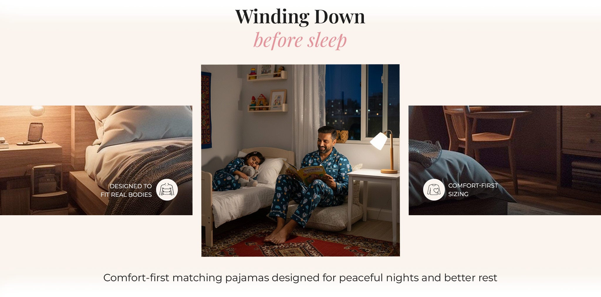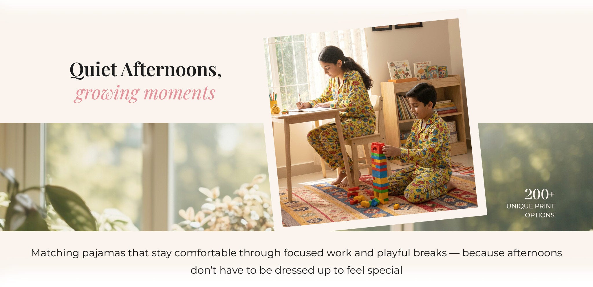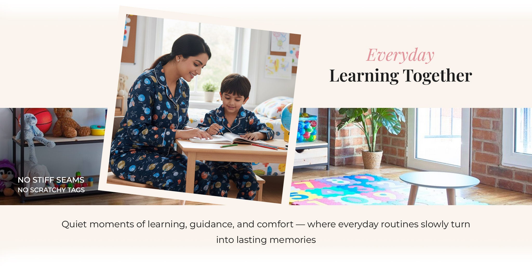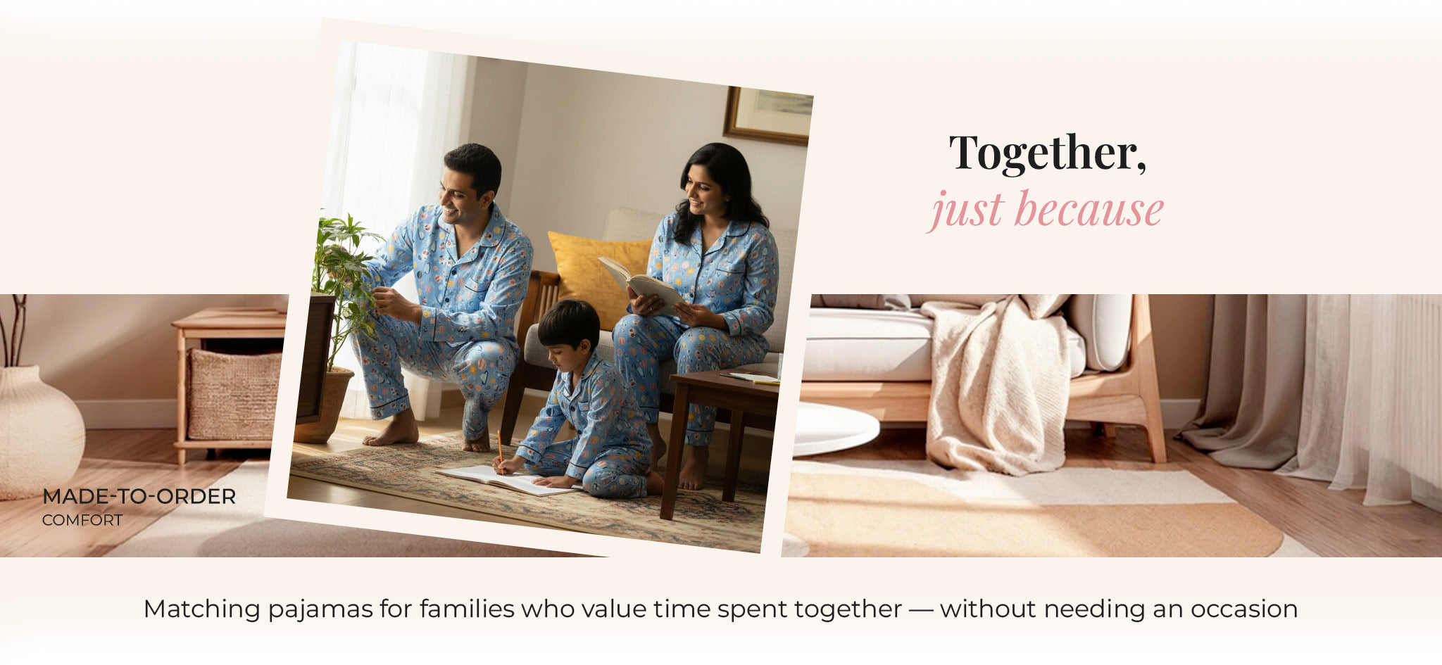 At Pajama Tribe, matching is a way of saying we’re here, together - across ages, roles, and routines. From siblings growing up side by side, to parents and children sharing daily rhythms, to families coming together under one roof, these are clothes made to live in, not show off.