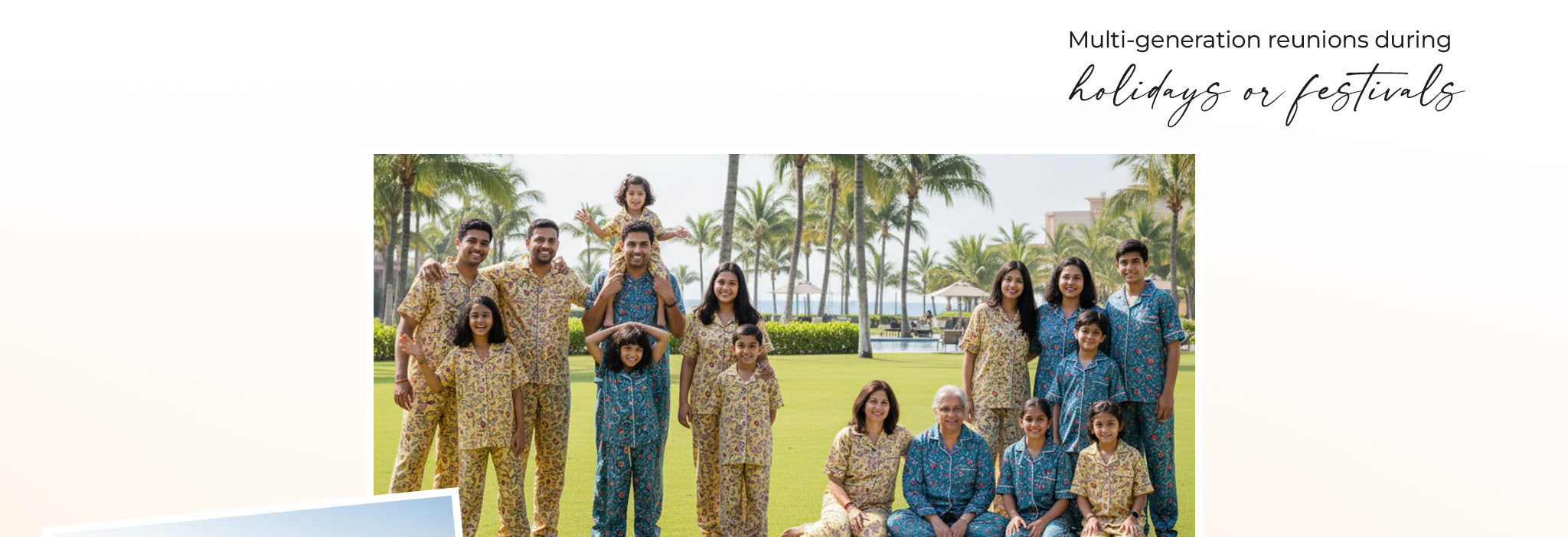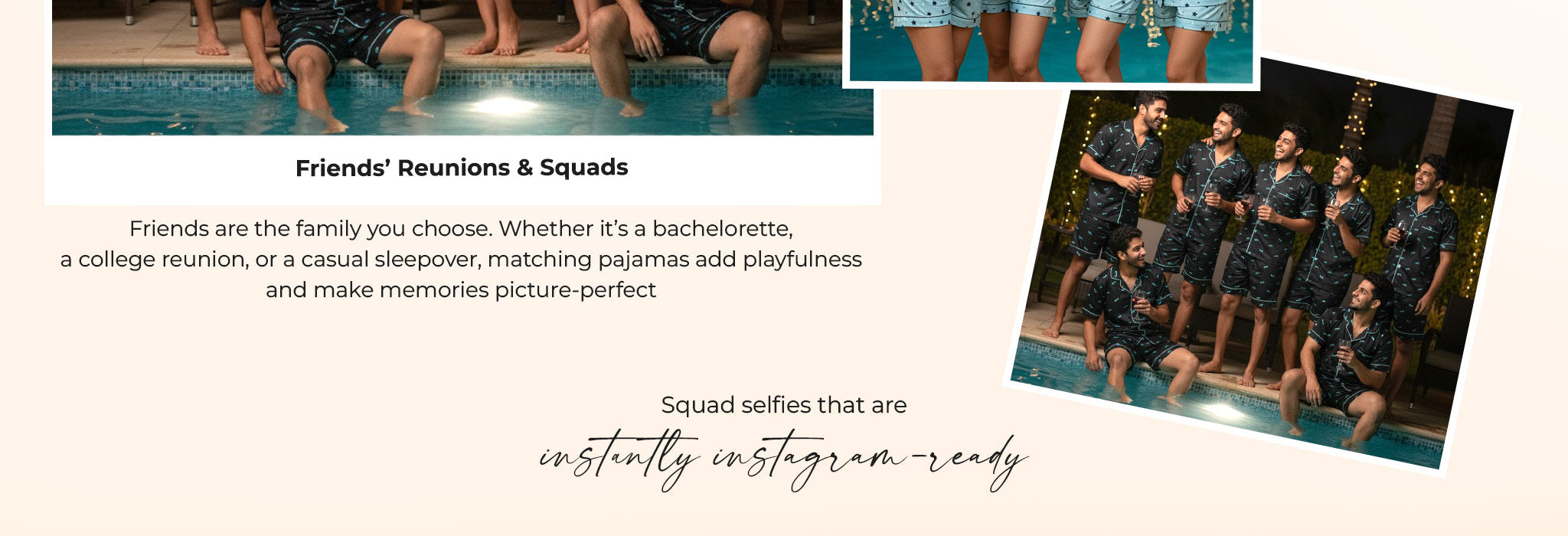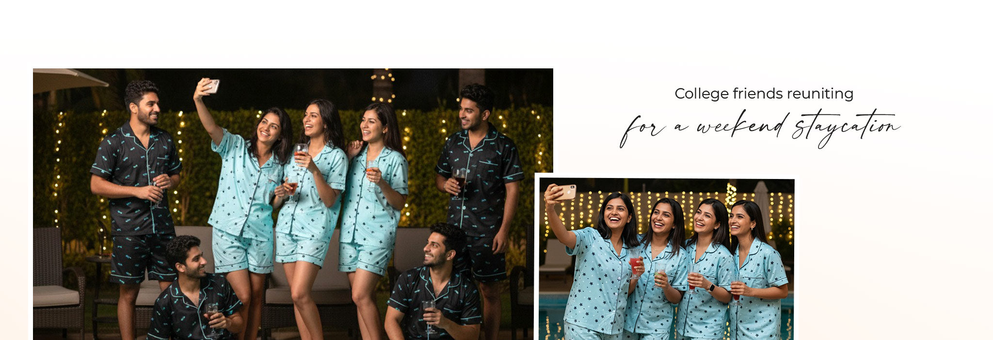 Reunions with friends are rare, but when they happen, they’re unforgettable. A staycation is the perfect excuse to relive old memories, share endless conversations, and create new moments together. Coordinated matching pajamas - men in one print, women in another - add a playful touch to the weekend. From group photos and laughter-filled nights to lazy mornings with coffee, matching sets make the whole experience more vibrant, memorable, and truly special for every member of the squad.
