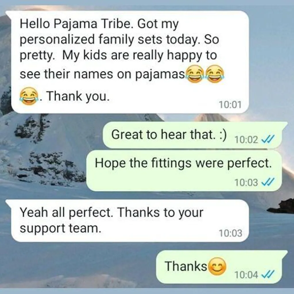 Hello Pajama Tribe. Got my personalized family sets today. So pretty. My kids are really happy to see their names on pajamas. :-) Thanks.