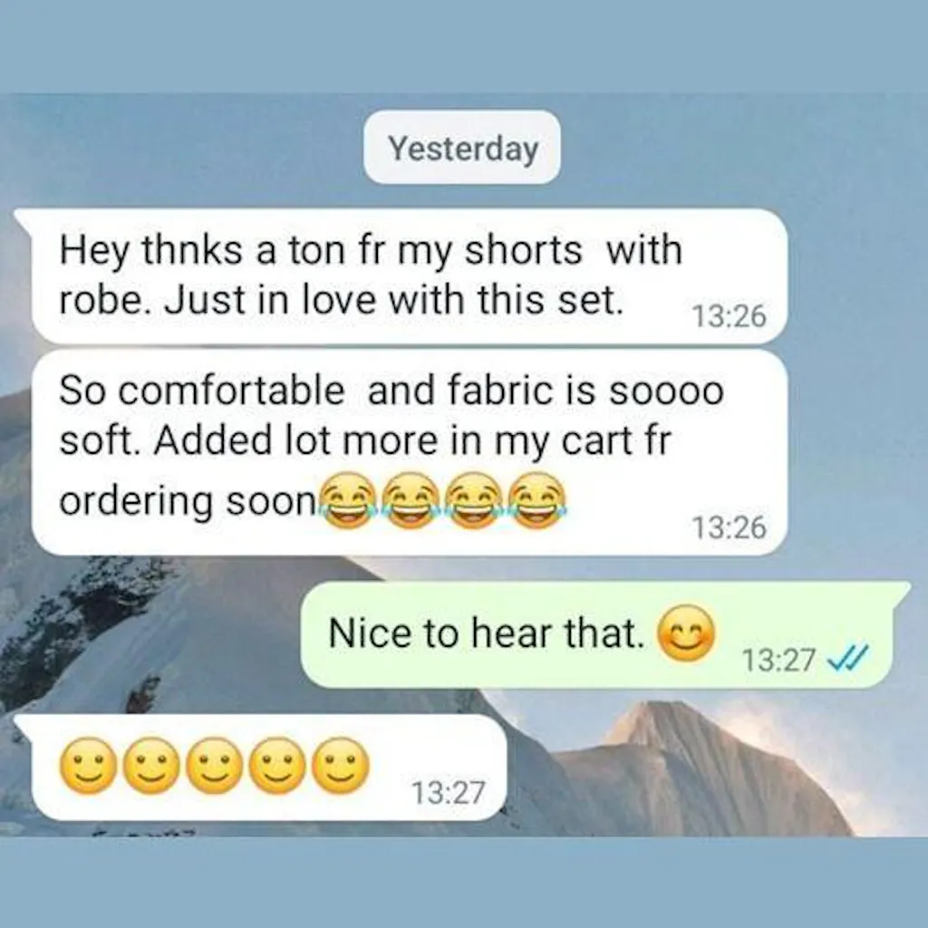 Hey thanks a ton fr my shorts with robe. Just in love with this set. So comfortable and fabric is sooo soft. Added a lot more in my cart for ordering soon. :-)