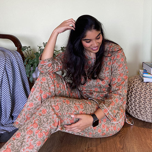 Discover Jaipuri block-printed cotton transformed into matching nightsuits and leisure wear. Shop the look and bring tradition home.