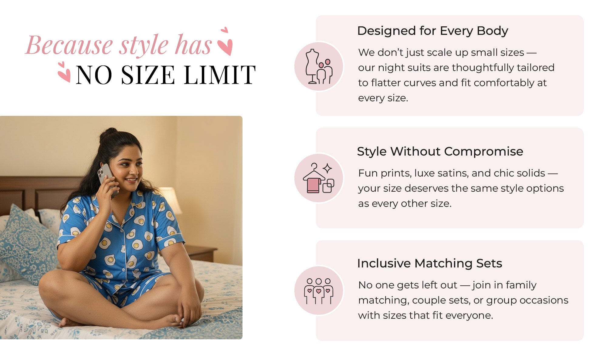 That’s why our Plus Size Edit is designed differently. We don’t just ‘scale up’ smaller sizes; we thoughtfully design night suits to flatter curves, give you room to breathe, and still bring you the same fun prints and chic fabrics available in every other size.