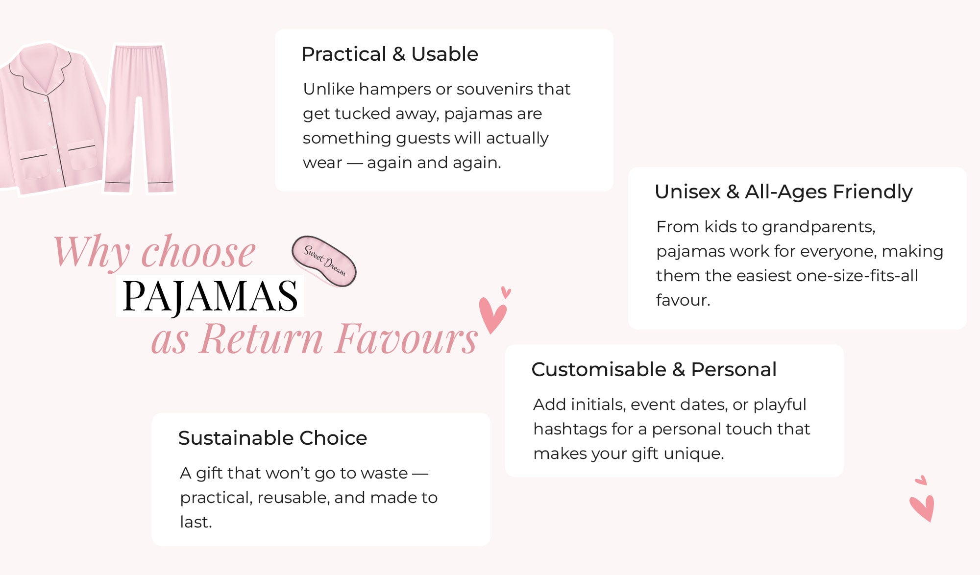 Your guests expect the usual — candles, hampers, or keepsakes. But pajamas as return favours break the pattern, surprising them with something they’ll truly use and enjoy. Soft, stylish, and personal, they feel like a gesture of care rather than a formality. A thank-you that lingers long after the event, every time they slip into comfort.