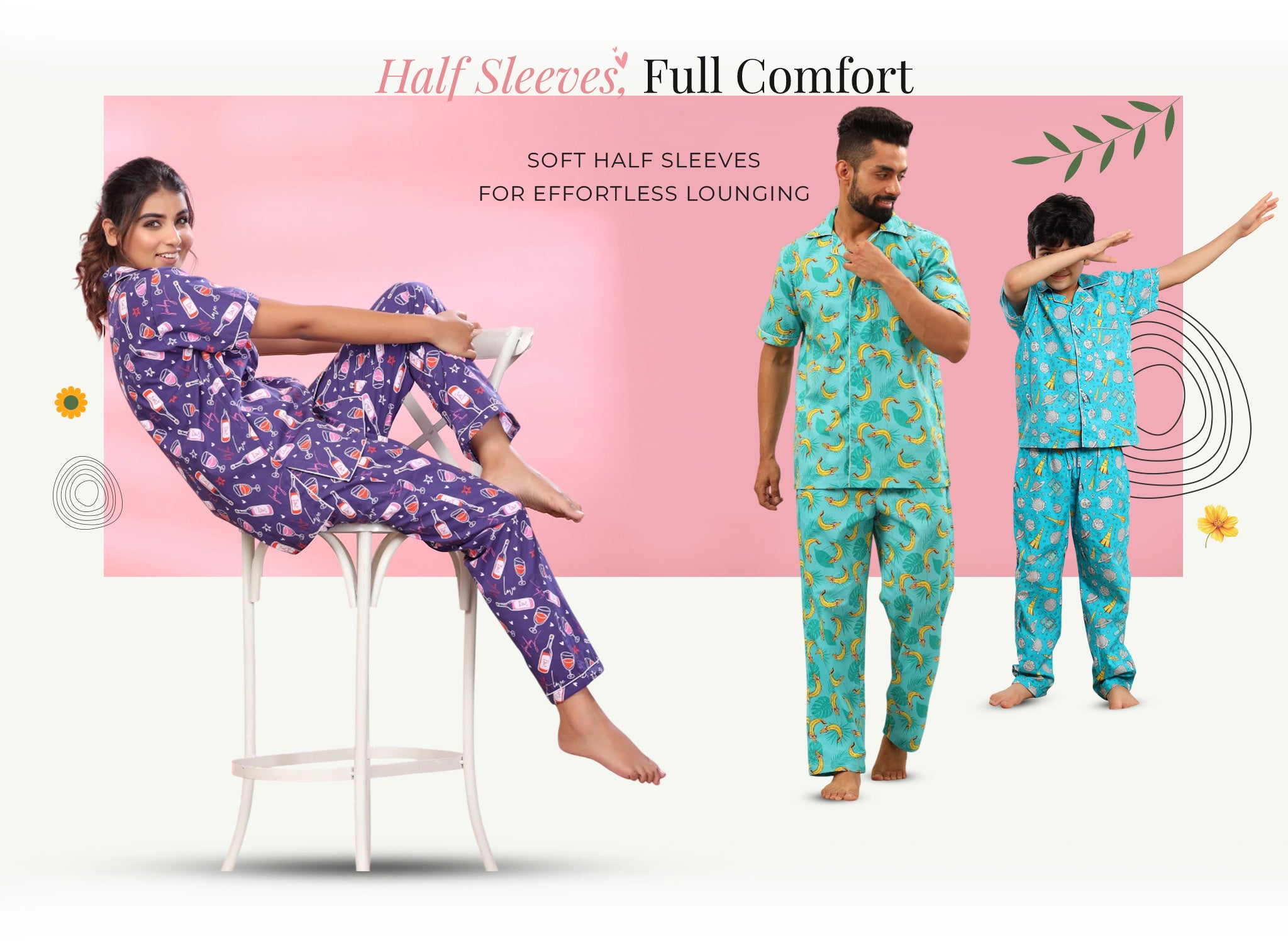 Soft half-sleeve silhouettes bring the perfect balance of ease and comfort. Designed for relaxed movement and breathable wear, they feel light through the day and gentle through the night.