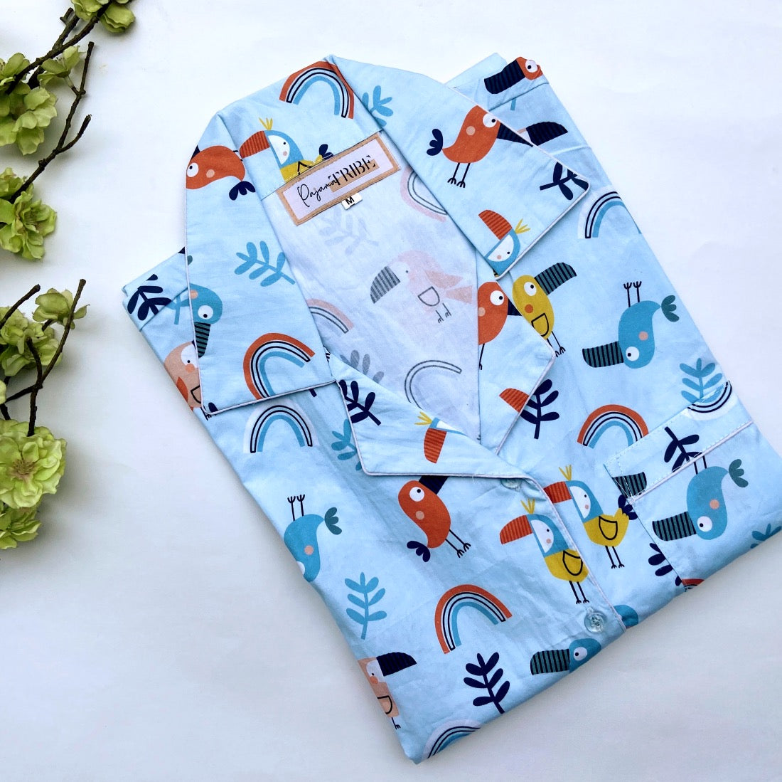 Cheerful bird motifs designed for kids’ nightwear and joyful cousin pajama nights.