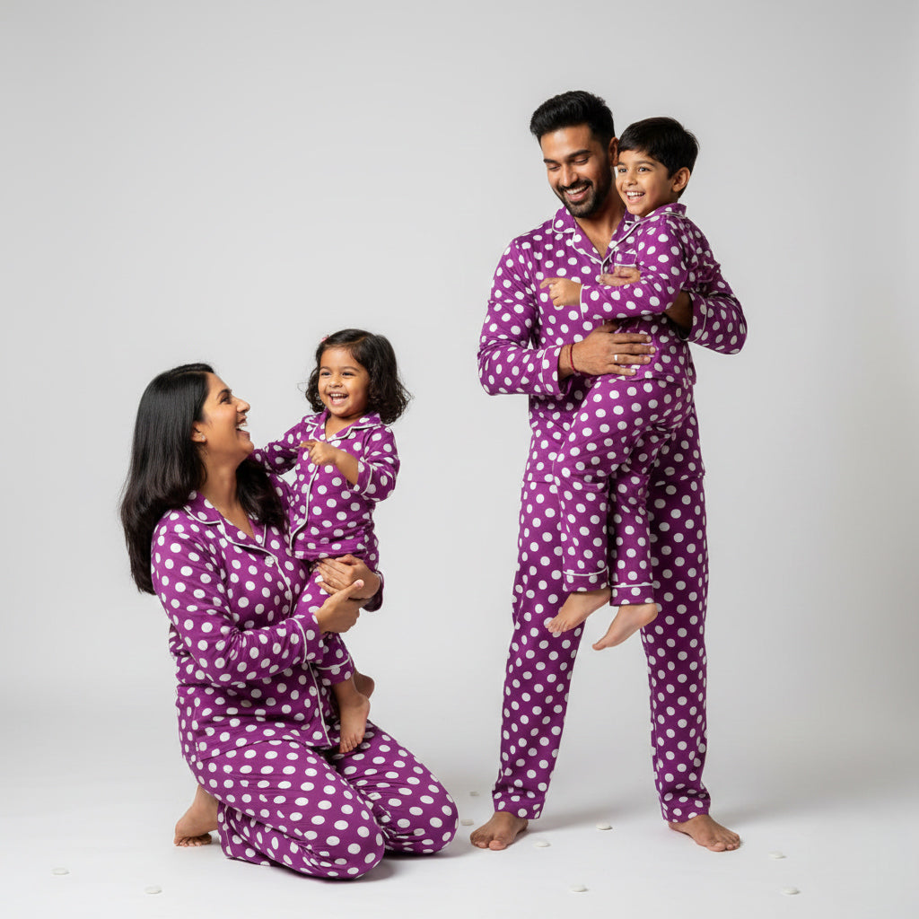 A cheerful burst of purple coziness, this notched-collar flannel set wraps your family in gentle winter warmth. Lighthearted polka dots bring joy to slow evenings, bedtime cuddles, and playful snuggle moments shared under one blanket.