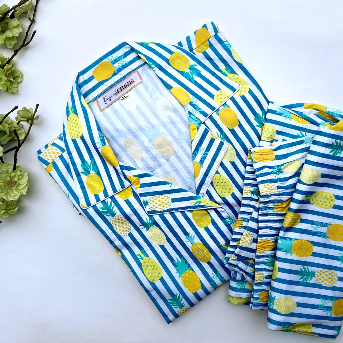 Juicy pineapples pop across breathable cotton poplin with a sunny vibe. Smooth, crisp, and fun for warm-weather comfort.
